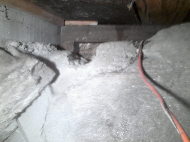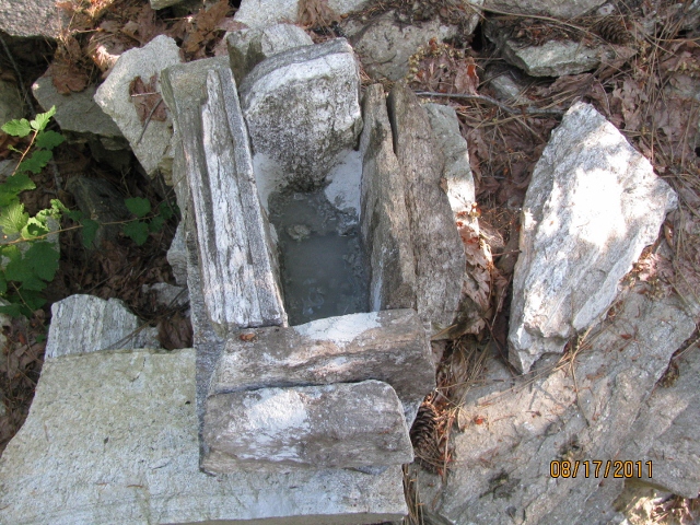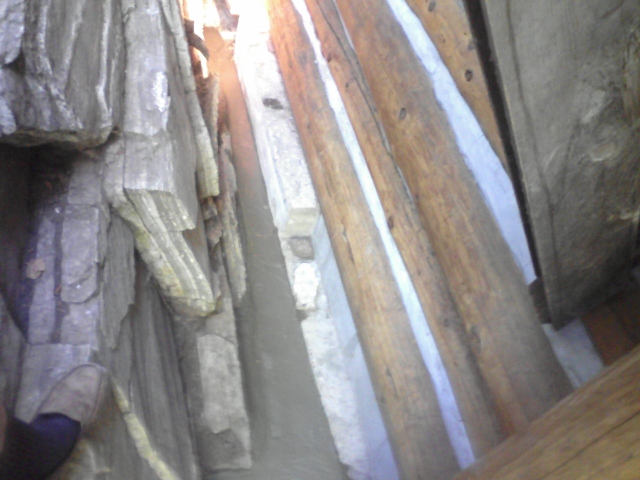 8/5/11 A view of the channel I cut in the top of the granite shelf on which I built the Grid 1 foundation wall. You can see the short 4x4 post holding up the Grid E1 corner of the porch deck at the upper left. You can also get an idea of the cramped working conditions down there.