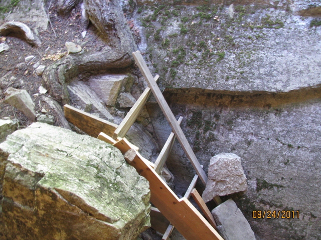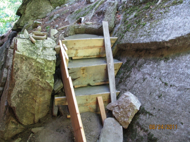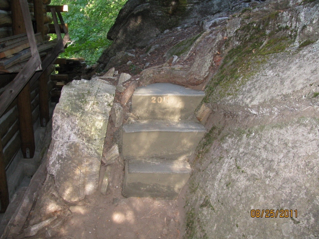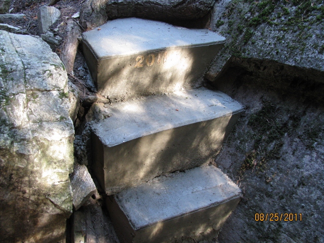 8/24/11 In order to use up three sacks of concrete mix left over from making the drainage channels behind the cabin, I decided to make a staircase on the steepest pitch of the path up to the high rock. The pitch is 45 degrees, and the rule of 25 says to make the treads and risers all 8 1/3 inches. The pitch had a rise and run of 25 inches, so making three steps came out perfectly. Here are the forms for the steps, fitted into the rocks.
