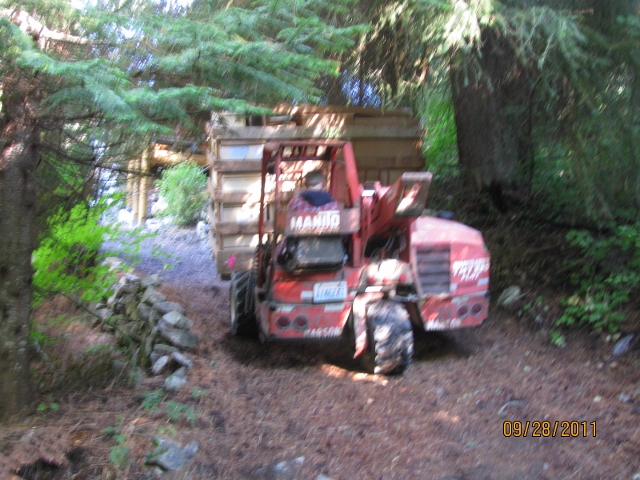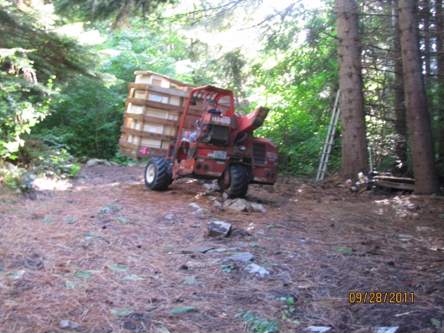 9/28/11 The forklift with its load of cabinets starting up the upper roadway.