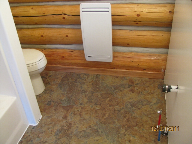 12/7/11 This picture shows the successful proof of concept for making the baseboards against the log walls from a 2x4 set into a notch in the log. I'll use that method for all the log walls.