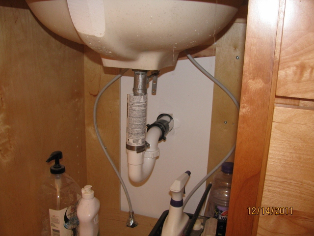 12/14/11 This shows the temporary jury-rigged plumbing under the sink using a Dap caulk tube as a P-trap extension.