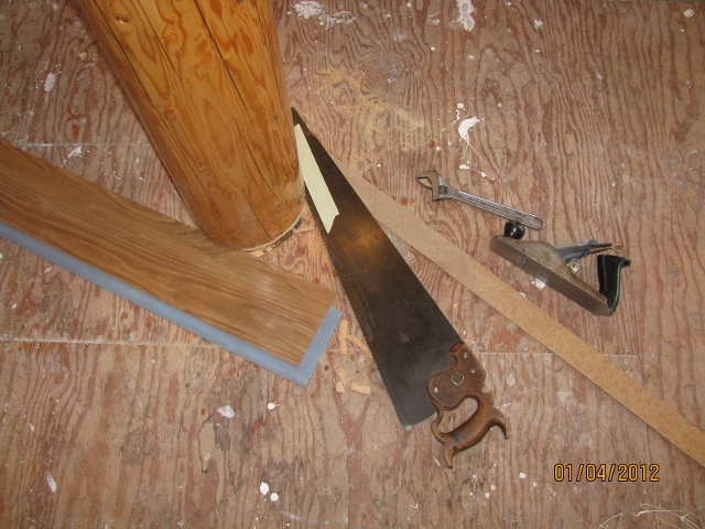 1/4/12 This picture shows the tools I used to cut the notch around the bottom of the columns which will receive the flooring panels. The notch is a quarter of an inch high and a half inch deep all the way around. The flooring will go into the notch a quarter of an inch. The notch was cut using the hand saw with the piece of tape on it for a depth guide to cut two kerfs. The lower kerf is level with the subfloor. The higher kerf was cut by resting the saw on the strip of masonite you see. The masonite was planed down, (with the hand plane,of course), to the right thickness to position the kerf correctly. The crescent wrench you see was used as a poor man's micrometer to get the thickness of the masonite right.