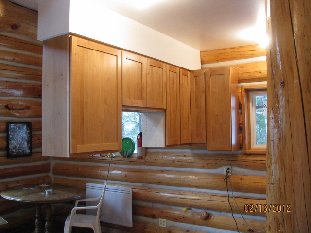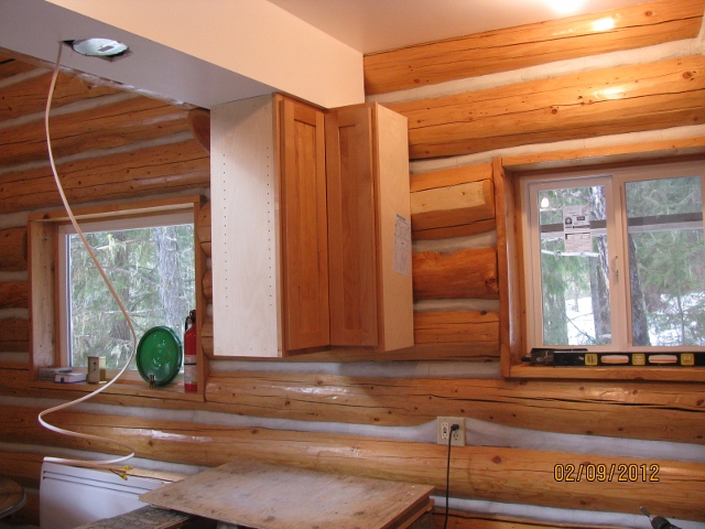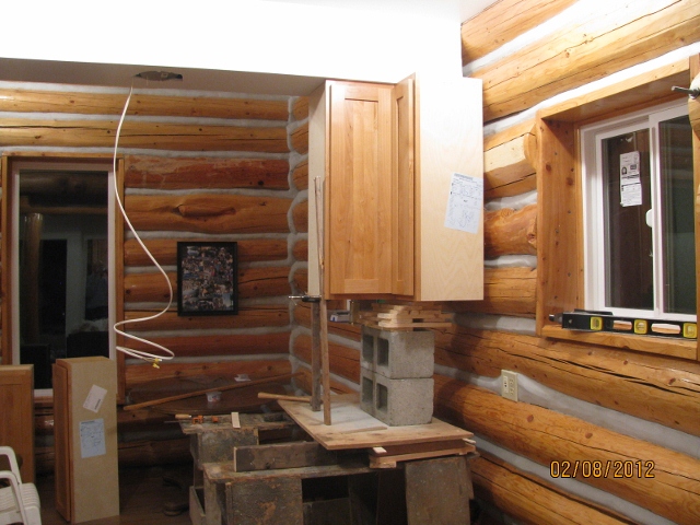 2/16/12 All of the cabinet units hanging from the soffit and to the left of the kitchen window are installed.
