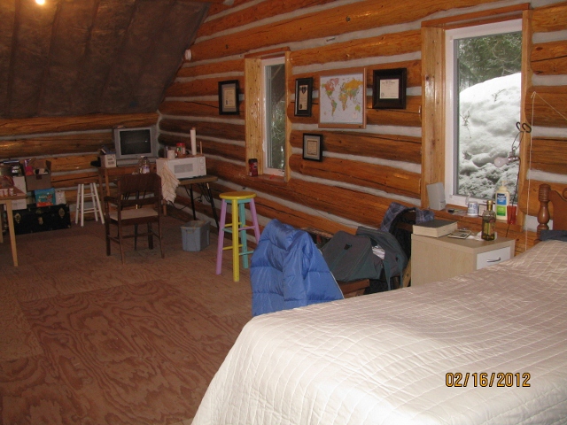 2/16/12 This picture is included just to show you my living quarters up in the loft. You see my bed and night stand in the right foreground; the small table with the microwave where I eat my meals while watching courses on DVD; the large table, mostly out of view, on the left where I store dishes, food, and clutter. It is spacious, comfortable, and delightful.