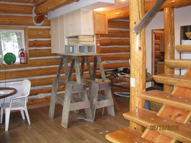 2/16/12 The kitchen cabinet unit that will hold the range hood is held in place by the scaffolding you see prior to being screwed firmly in place.