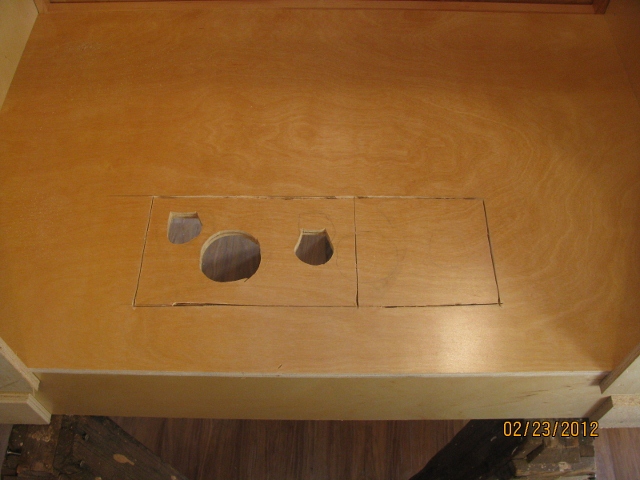 2/23/12 This is an example of measuring once and cutting at least twice. Because of taking the wrong dimension off of a drawing, I cut the holes for the plumbing pipes in the kitchen sink cabinet six inches off. After some advice and sleeping on it, I figured out how to move the holes six inches.