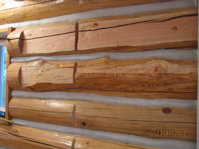 3/7/12 This detail shows how the wall log was cut to form a ledge to help support the cabinet above the refrigerator.