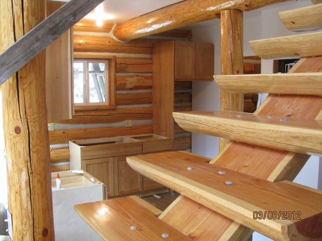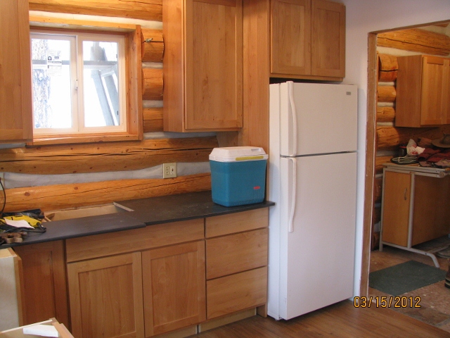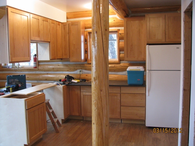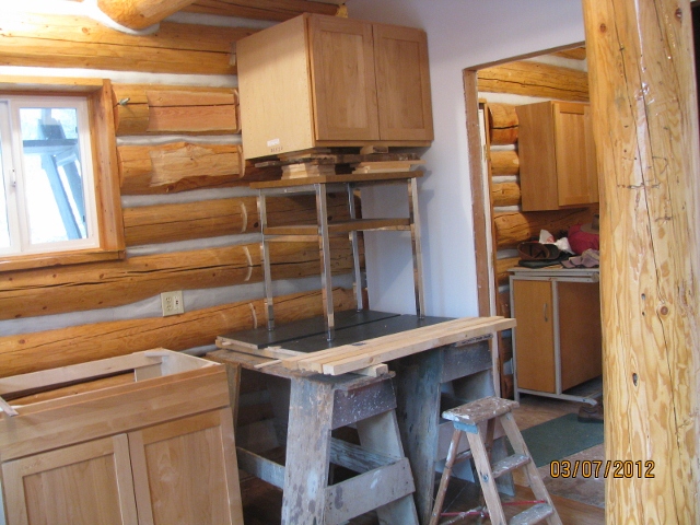 3/15/12 The cabinets against the log wall are installed. The countertop is just some temporary scrap pieces of particle board.