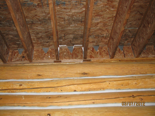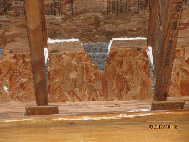 3/7/12 This picture shows the birdblock above the Grid A wall where the mice figured out how to break in to the cabin. This picture was taken after I plugged up all the possible holes with white caulk.