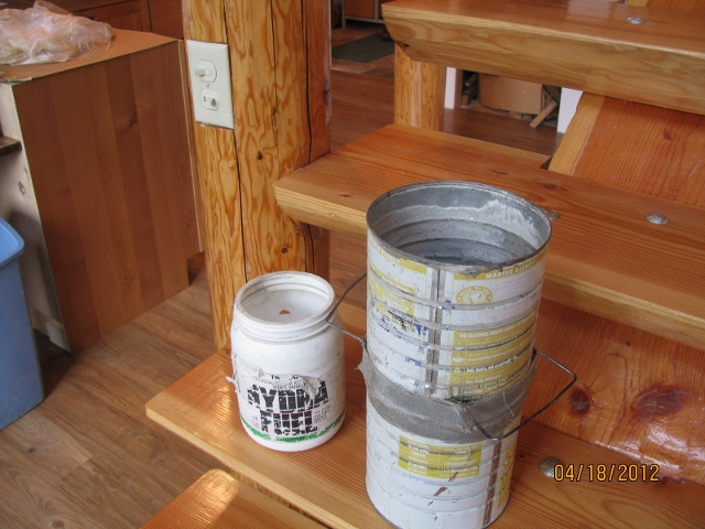4/18/12 This is a picture of the containers I use to get the proportions exactly right when I mix mortar. The one on the left, with the hole in the back side is for water and the double coffee can is for the mortar mix. I took this picture to help answer a question I got from a reader of this website.