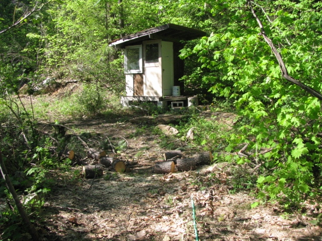 5/7/13 Here is the remains of a pine tree that fell across the trail to the privy (in the background) after I limbed and bucked it.