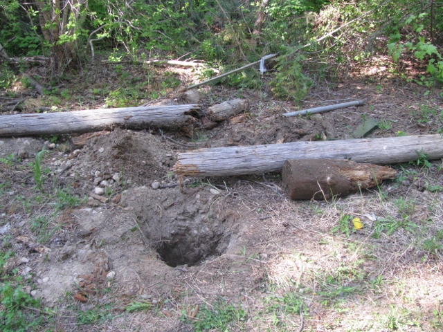 5/8/13 Here you can see the broken gate log that I have to replace and you can see the stump from the gate post that I dug out and removed from the hole.