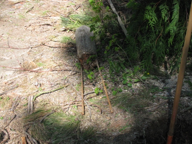 5/8/13 This is the top of the old eastern gate post that had rotted off at the ground line and which I had held in place by driving those two rebar you see into the ground. It lasted for quite a while that way but now needs to be replaced.