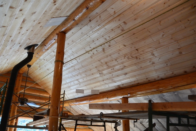 2/12/15 The ceiling boards are finally complete up to the ridgepole for half of the Grid B1,C3 bay. This is the view toward the Grid 3 gable.