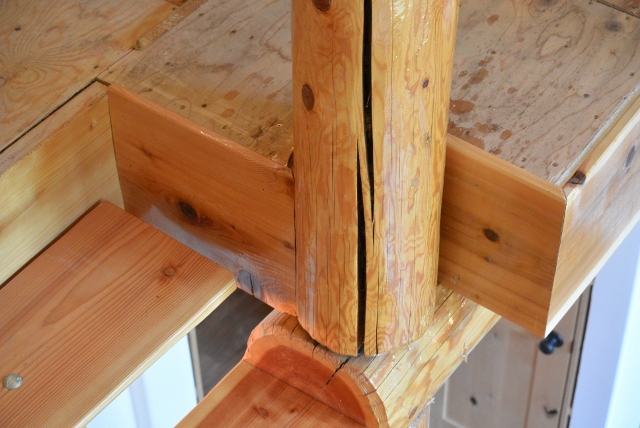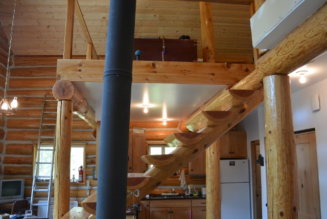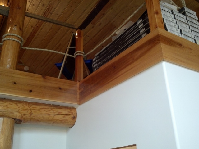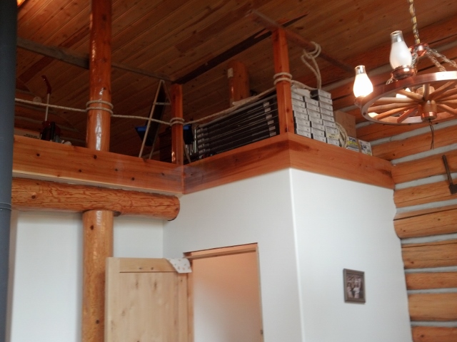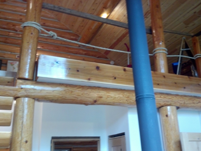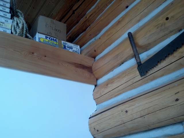 5/14/15 Because the board was cut too long the first time, there wasn't quite enough for this second board to reach snugly against the log wall. Those gaps are the result.