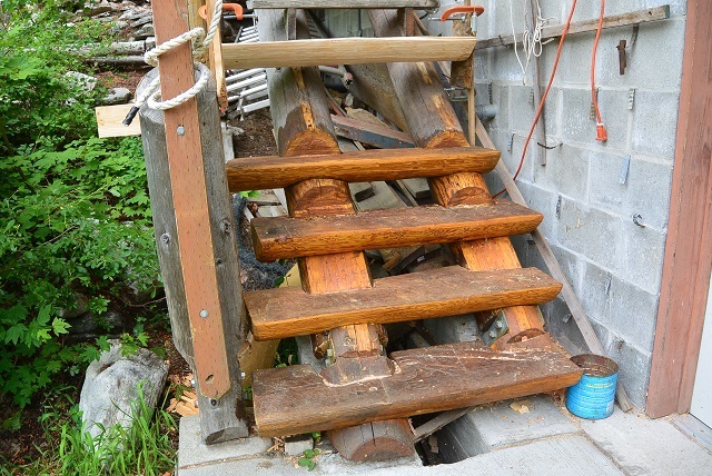 6/2/16 Four log slab stair treads are in place in the back staircase and the fifth tread blank slab is suspended over the stringers in position for scribing. After scribing, the tread blank and both stringers will be notched so that the tread fits securely in the staircase where it belongs.