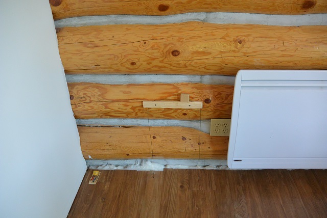 4/13/16 Work has started on the installation of the log slab treads on the back staircase. Here you can see (if you work at it) the two horizontal gauge rails suspended over the sides of the staircase. These provide a reference for locating the horizontal position of the noses of the treads as well as the vertical position of the tread surfaces of the treads. Here I am sawing small notches at each of the marks marking the position of the tread noses. The notches will make sure that the plumb bob strings stay where they are supposed to.