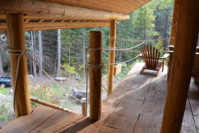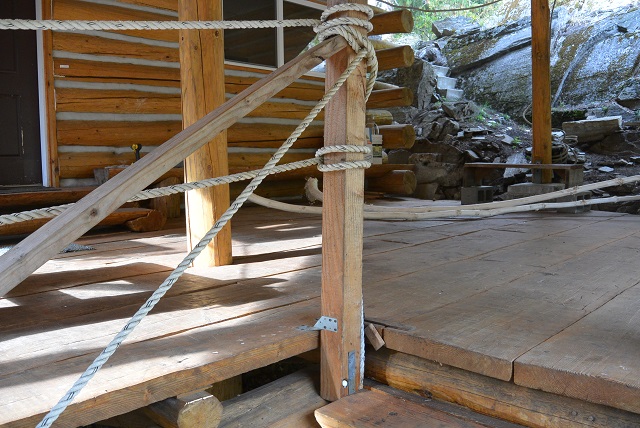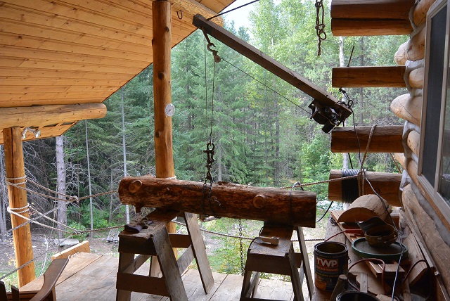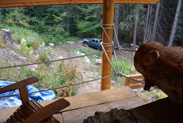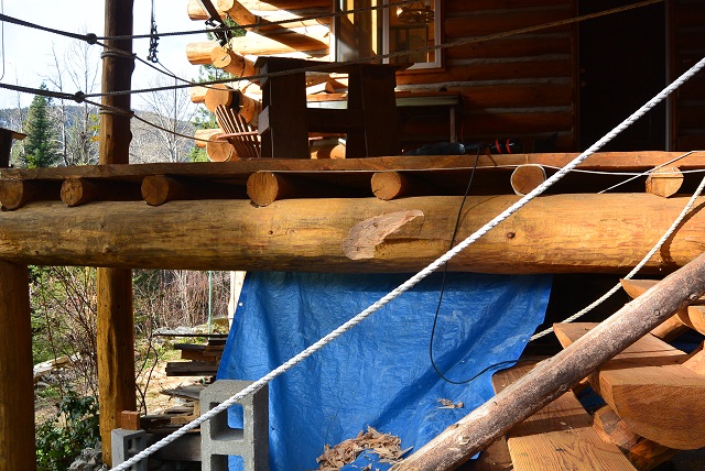 8/30/16 Work has started on the installation of the railing system on the front staircase. Here you can see (if you work at it) The skid trail made by skidding the upper newel post log up the upper roadway from just beyond the hairpin turn. You can see the remnant of the log left down there in front of the truck. The porch crane was used as a skidder and it also hoisted the log up onto the porch deck and set it on the sawhorses.