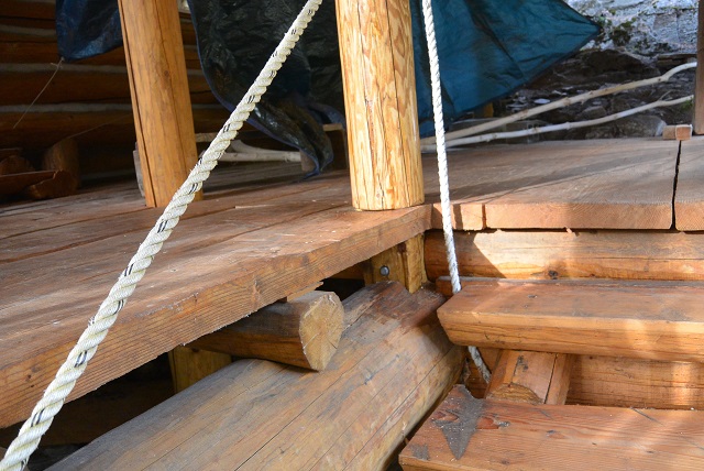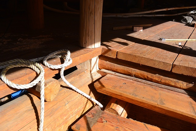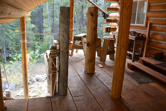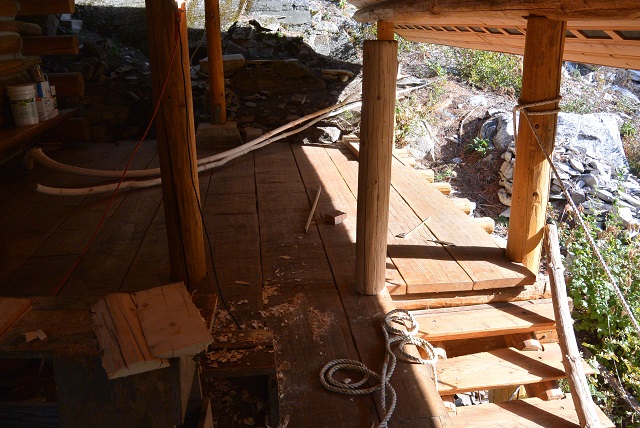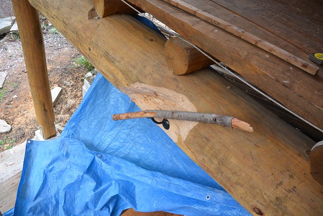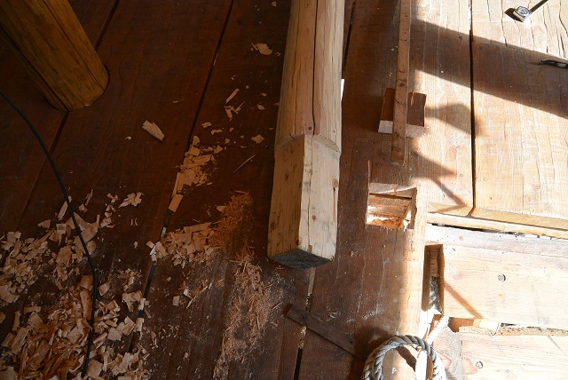 9/29/16 The tenon has been cut in the end of the newel post and the mortise hole has been cut through the deck, alongside the joist log, and down into the big porch beam.