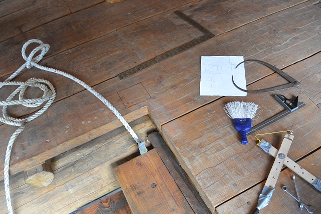 9/21/16 Here you see the 5-inch square on the deck marking the site of the mortise hole for the new permanent newel post.