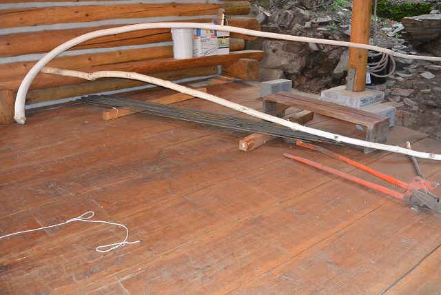 11/2/16 Dr. Dick's rebar cutter/bender has been lag screwed in position on the porch deck. Above it you can see the big curved vine maple future handrail for the staircase and below it, a supply of rebar for making the first batch of balusters. The balusters for all the stair rails, the porch deck rails, and the loft rails will be made from #3 rebar. They will all be produced here.