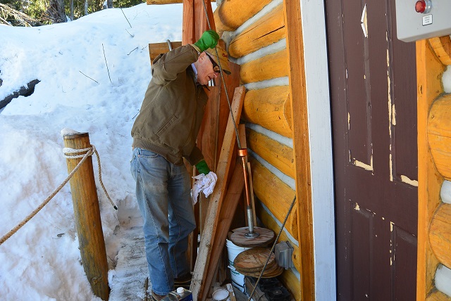 2/10/17 Here you can see that the holes have been drilled for the lag screw, the lag screw is started through the rail and the wrench is hanging from the lag screw ready to fasten the rail to the scab log.