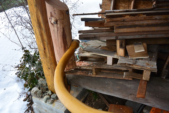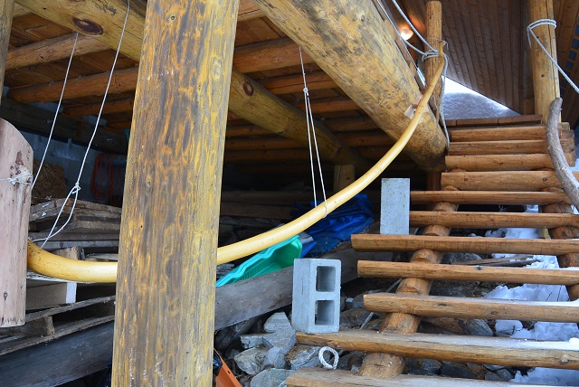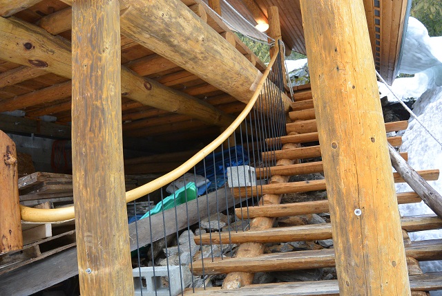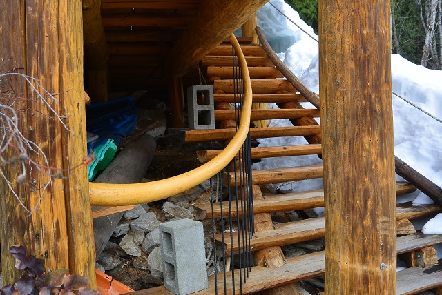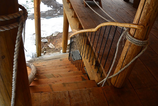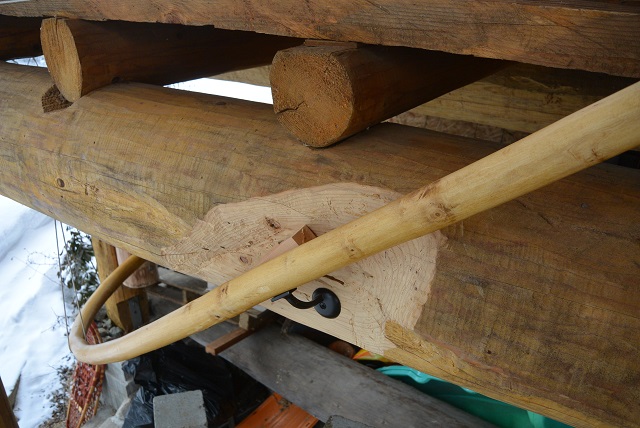2/10/17 The vine maple handrail on the front staircase is temporarily held in place by ropes and the center rail bracket.
