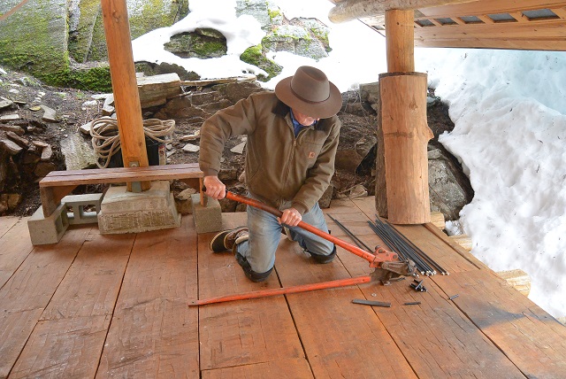3/22/17 Paul is cutting the rebar balusters to length using Dr. Dick's handy rebar cutter/bender.