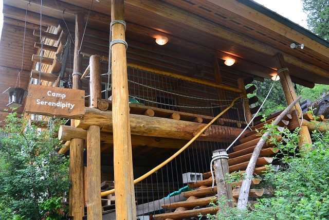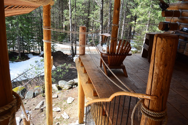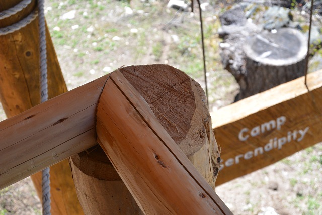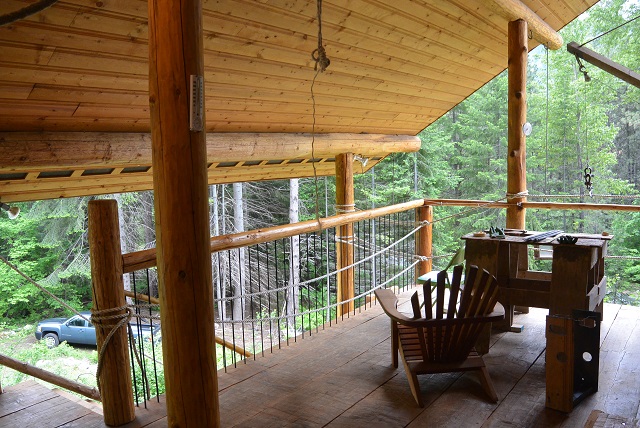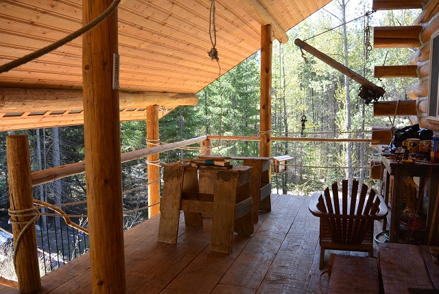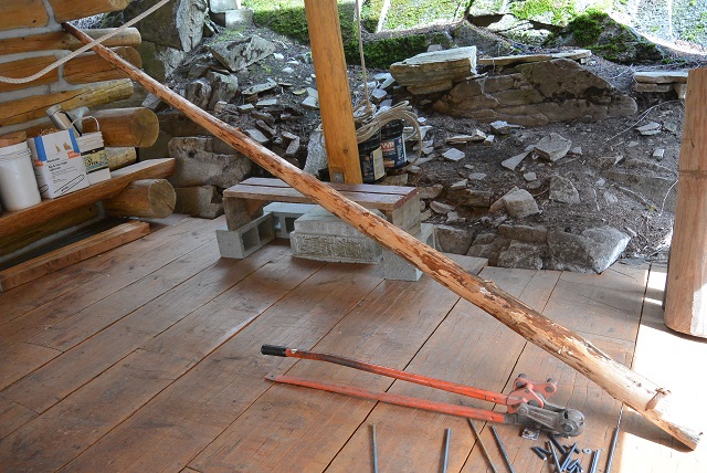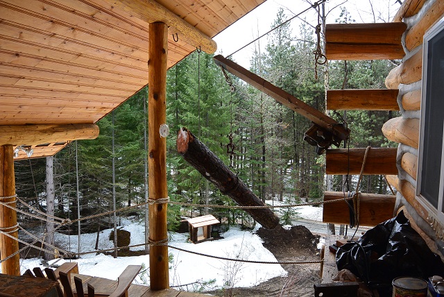 4/5/17 Building the railing system for the porch deck starts with the harvesting of a log from the end of the gate log. Here you see that the log has been cut and the porch crane is rigged to drag it up onto the porch deck.