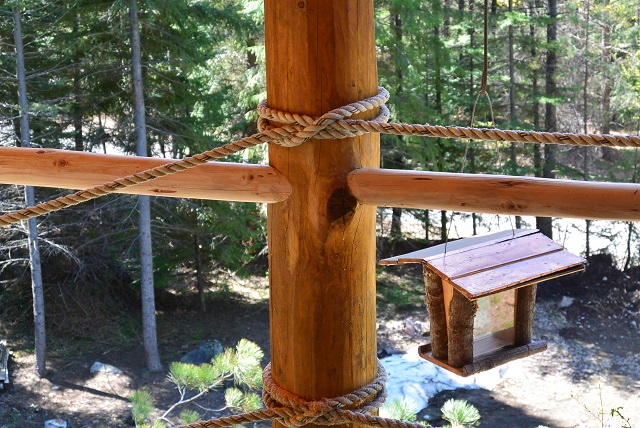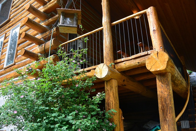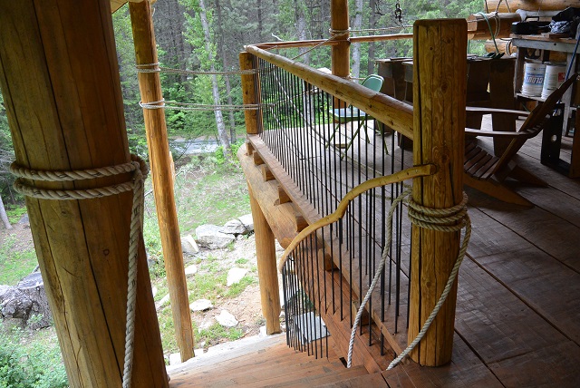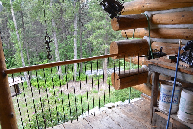 6/7/17 Except for the spaces between the projecting wall logs, the railings on this end of the porch are finished.