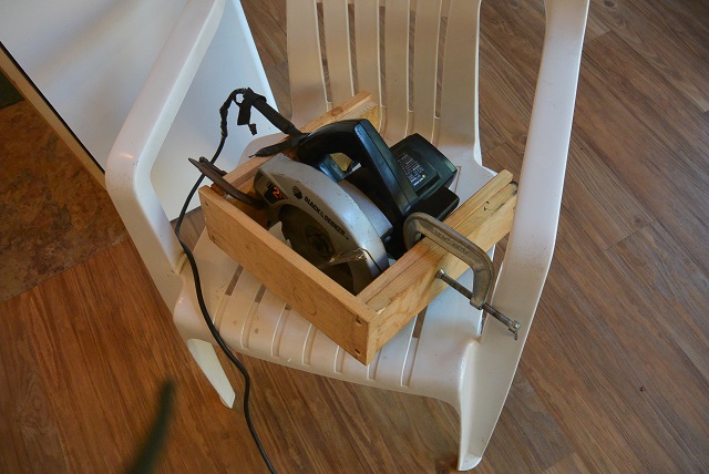 9/28/17 Here you see the Skilsaw in its carriage in the cutting position resting on the floor.