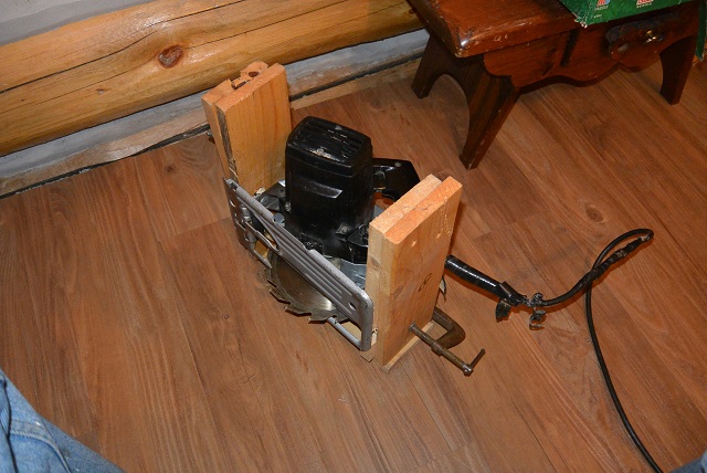 9/28/17 On the subject of animal control, a new priority has been established. I will put the railing projects on hold while I seal the first floor of the cabin against animals coming up from the crawl space. There are two possible ways through the subfloor: one is through holes made for plumbing, and the other is around the perimeter of the floor. The plumbing holes were plugged this week using hardware cloth. The perimeter will be plugged by installing 2x4s as baseboards all the way around. To seat the baseboards tightly against the wall logs, a notch will be cut in the logs to receive the 2x4s. To make the horizontal cut for the notch, the Skilsaw mounted in the carriage shown in the picture will be used. The Bosch bulldog roto-hammer fitted with a wood chisel bit will be used to cut away the rest of the notch below the kerf.
