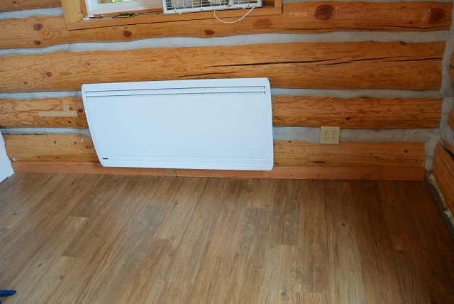 10/12/17 The baseboard from Grid E2.5 to E3 is finished. It makes that section mouseproof. In the center of the picture is the big wall-hung heater and on the left is the remote valve control mechanism.