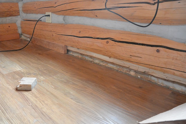 10/19/17 The two baseboards from Grid B3 to D3 are installed but they still need to be varnished. Those sections are now mouseproof, so the varnish can wait until the entire floor is sealed against mice.