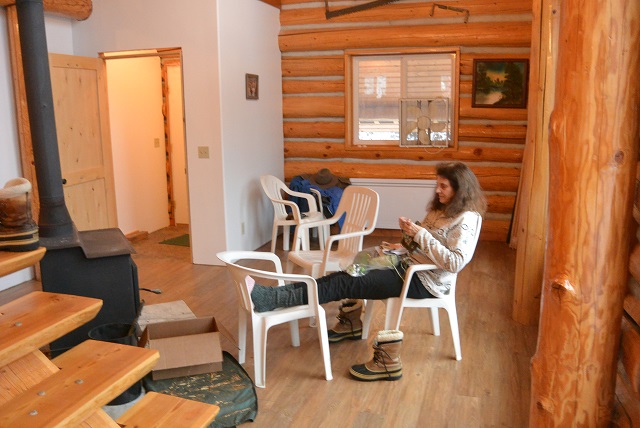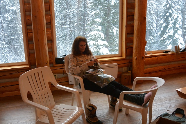 12/27/17 Ellen, up to the cabin for an overnighter, relaxing and knitting in front of a winter scene.