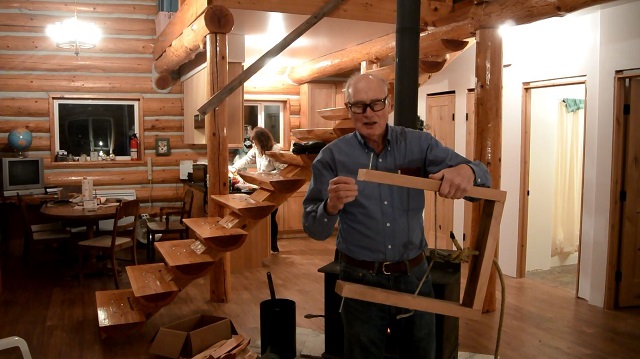 12/27/17 Paul showing his firewood hauling device. The nails in the ends of the 2x4 legs will be driven into the center of the firewood round to form an axle. Then the round will be rolled out of the woods by pulling on the big rope. Hopefully the firewood round will roll nicely. We'll see.