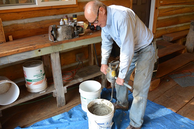 9/5/18 Here Paul is about to mix up a batch of bentonite slurry. It will be used in an attempt to plug up the leaky springbox by being poured in and working its way down into the gravel and plugging the leaks so that the water level in the box will stay up above the overflow pipe. At least that's the theory and the hope.