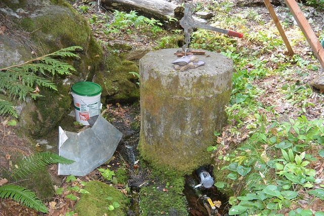 9/5/18 This is a close-up of the plumbing at the springbox. The overflow is the highest pipe with the screen over it. If you look closely, you can see a small steam of water coming out of it. The hope is that after the bentonite plugs up the gravel beneath the concrete slab, there will be more water coming out of this pipe. The next pipe, to the left of the overflow pipe, is the service pipe that delivers water to the cabin. It starts with that 3" bell reducer followed by a union, the main shut-off valve with the yellow handle, an air valve, and then the 1" copper pipe going off in the creek bed. This plumbing was opened up and capped during the bentonite treatment to avoid getting bentonite into the plumbing.