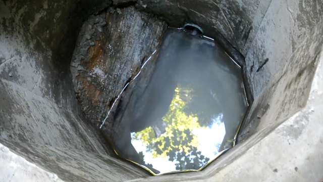 9/17/18 Looking down into the springbox after the aluminum skirt has been removed. The water got stirred up and cloudy as a result of pulling the skirt out, but it isn't too bad. You can see a clear streak of water coming into the spring at the left and going up over to the overflow pipe to the right.