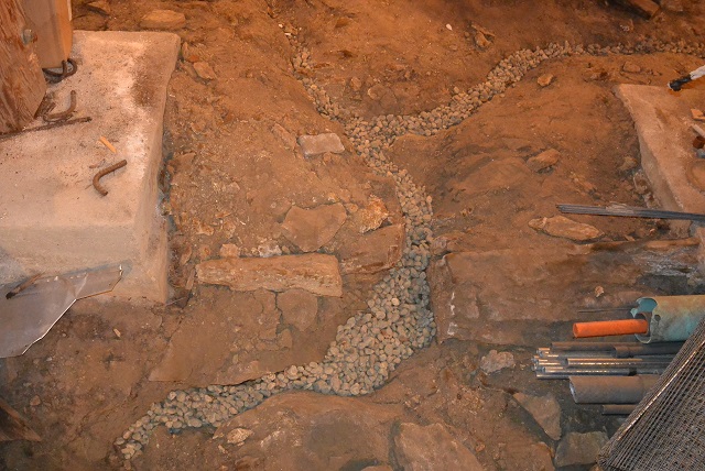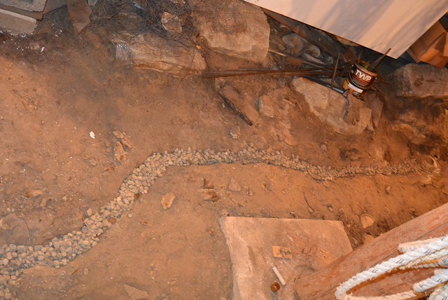 10/18/18 Here you see the start of the gravel poured into the drainage channel that cuts through the outcrop running across the crawlspace floor.