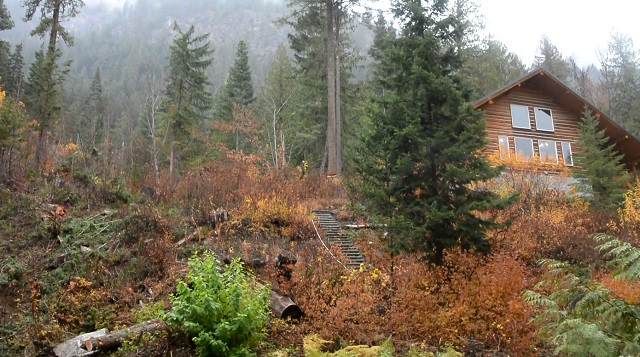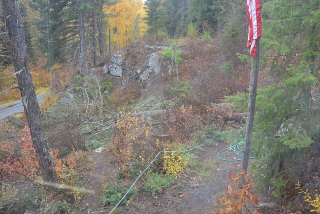 10/25/18 At the top center, you can see a big pine tree right next to a huge Doug fir. Robert has undercut both trees and will fell them together because the top branches (out of the picture) are intertwined. You can see the undercut in the fir but the cut is lower on the pine so it is hidden by the rocks. We call the valley to the left "Little Yosemite". That is where both trees will land in about two minutes.