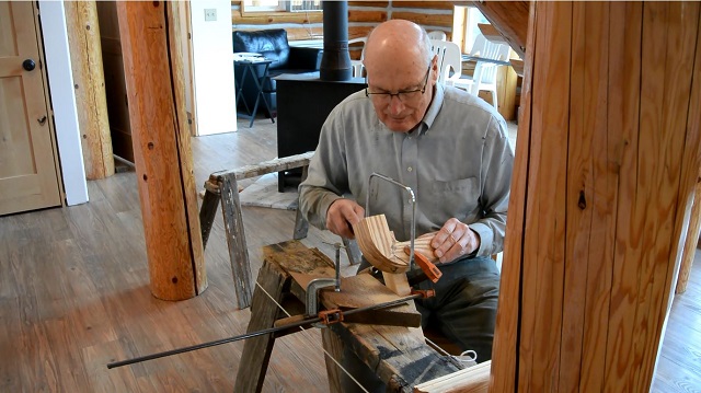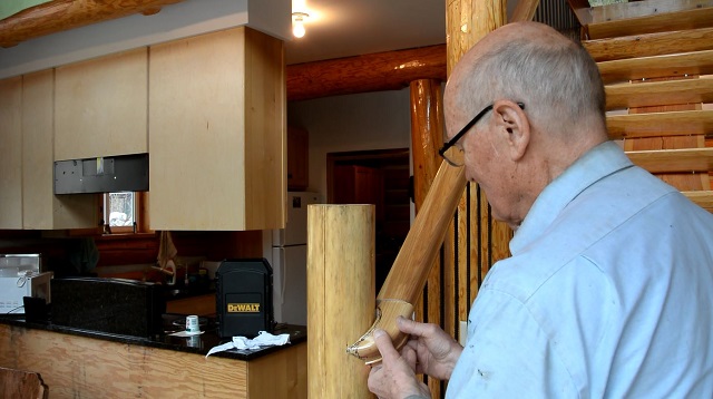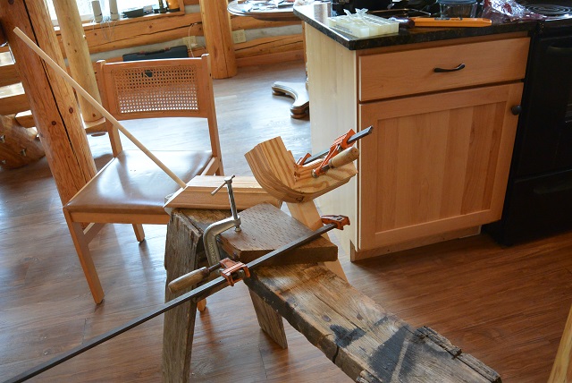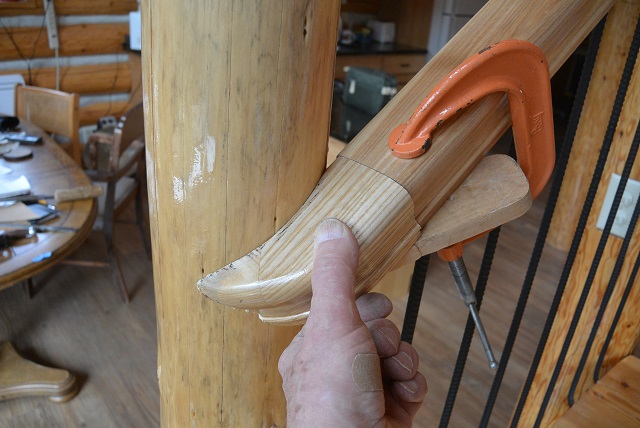 5/8/20 Here is the construction of the upper handrail termination in progress. The parts are temporarily fastened together without glue except for the final straight part. That needs to be coped to fit against the log column. You can see the scribe line showing where it will be cut to fit. Three of the eight remaining balusters are more-or-less in place here.