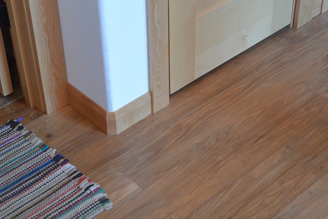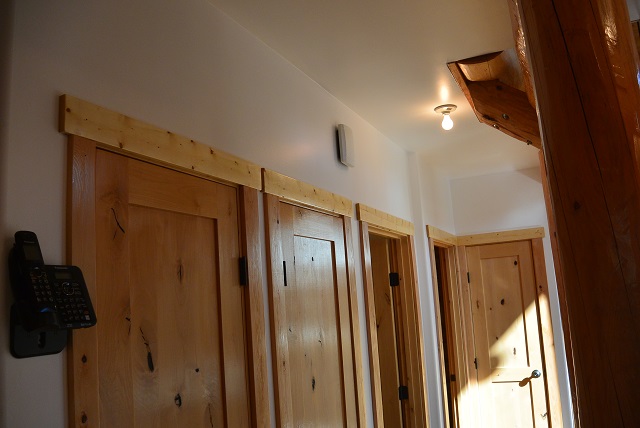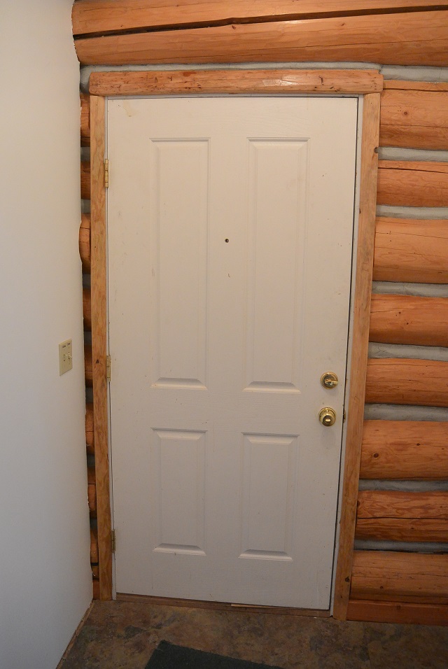 2/5/21 Here is a shot of the completed door casing for the back door. The remaining casings, for the interior doors, will be made of more finished lumber. This rustic look was chosen for the exterior doors based on a recommendation from Bill. Good idea.