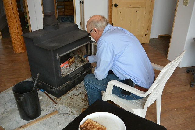 1/12/21 The power went out early in the morning so I cooked my breakfast using the wood stove. Here you see me making a second slice of toast.