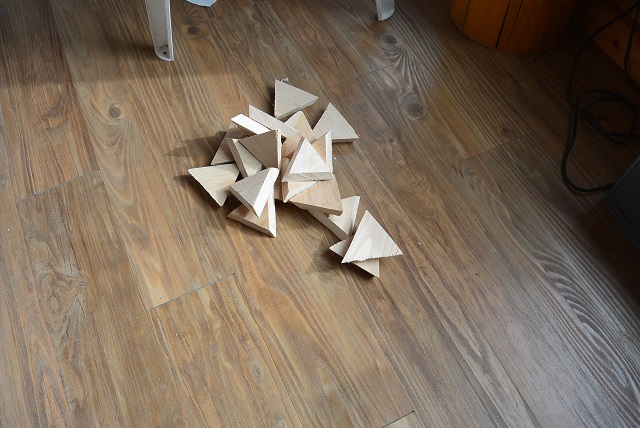 4/7/21 A fun whim project to use 1x4 remnants of the casing material was to try to make a wooden icosahedron. Here the parts are cut.