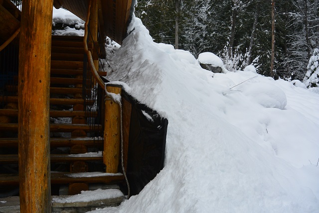 12/24/21 After looking around, I found many more sets of tracks. One set showed that the cougar had followed the trail in front of the cabin over to the trail leading to the hairpin turn. That part of the trail had been obliterated by a huge avalanche from the roof, but the trail in front of the cabin was clear as you can see from this picture in front of the woodpile. Another set of tracks showed that he had climbed all the way up the back stairs and across the back porch. I don't know where he went after that.