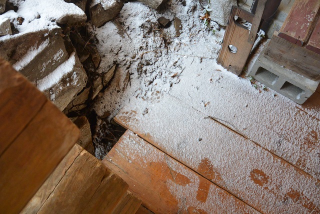 12/16/21 This winter, to save a lot of shoveling, I decided to set up a sheet of OSB against each of the newel posts at the foot of the front and back staircases. The sheets are intended to prevent the huge snow berm, that forms from snow falling off the roof, from avalanching down onto the stoop and the lower steps of the staircase. I had set those sheets up the previous week and they worked great. Now, however, the berms were high enough to overflow over the top of the OSB sheets. So, in the back, I added three more pieces of plywood on top of the OSB to stop the overflow. In this picture you can see the three additional sheets on top of the original OSB, and you can see the berm up against them.