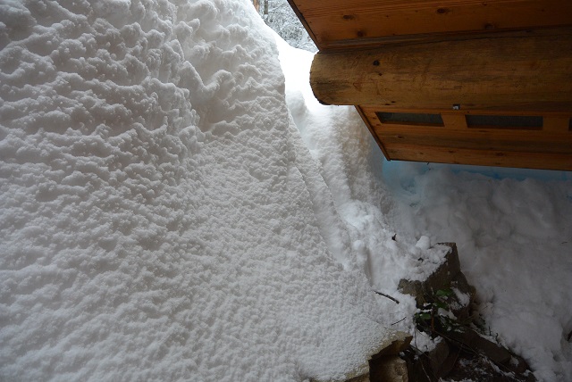 12/24/21 Here you can see where the cougar made his exit from the porch. There was barely enough room between the roof and the snow on the cliff for the cougar to climb and jump out leaving these tracks.