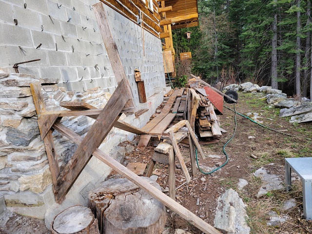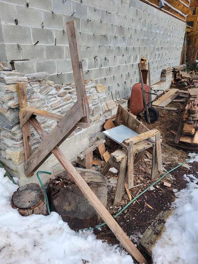 2/9/24 This picture is messy but it shows a lot. It shows an early step in the transition from an unworkable mess of clutter, to an organized work environment with uncluttered access to the block wall supported by a a sturdy scaffold system complete with an accessible mortar board and lifting devices for heavy loads. The starts of parts of the system are visible in this picture. Starting in the back, at the far right, you can see a "before" picture with a board pile that will have to be moved out away from the wall just as they have been moved in the center of the picture. That leaves a 3-foot margin for the scaffold planks. Since the first courses of stones are low to the ground, the scaffolding is not necessary at the beginning. But as the wall grows, the scaffolding will have to follow. To start with, short 2x4s will act like railroad ties running under and perpendicular to the planks. You can see four of those "ties" under the two planks near the top of the picture. As planks are added, they will be joined end-to-end by z-brackets which are flexible and which bear heavy loads in one direction. That will allow the planks to be supported by scaffold frames once they get up off the ground. You can see the first of five such frames already in place in the foreground. This winter, the "ties" will be put in place and the planks will be fastened in a long chain with z-brackets but left lying on the ground. They will wait in that position until spring when work can resume laying up stones. That work will be done from the scaffold deck and as the wall grows, the planks will be raised and scaffold frames will be installed under them to hold them up. They will move up from there.