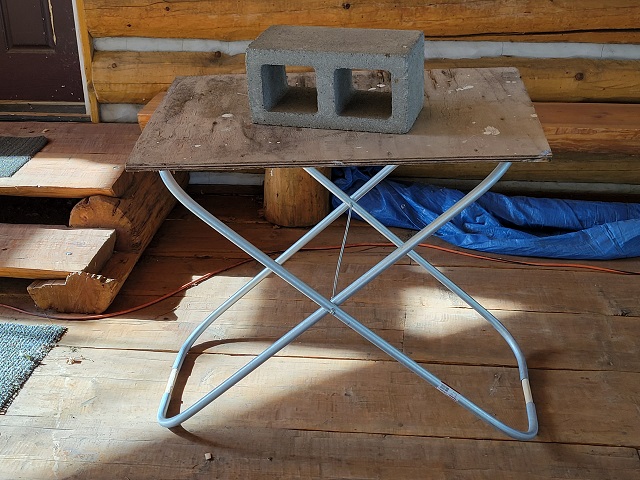 3/7/24 This is the Mortar Stand. It will stand on the scaffold with me as I place stones in the foundation wall. It will hold the mortar board that you see (the concrete block is there only as a demonstration of the strength of the stand), with its load of mortar, or stones, or tools, or whatever I need. The stand will move around the wall with me as I move around.
